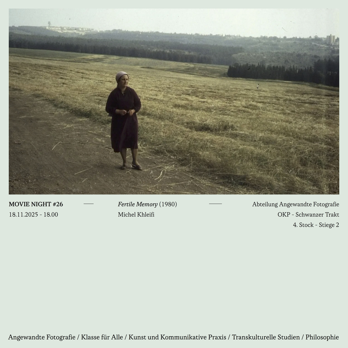 MOVIE NIGHTSis a format for a transdisciplinary exchange: Starting each time from one film, we open the space for a conversation about the relations between production of images and their conditions – modes of narration, authorship, history, politics and effects on society. We show fiction, documentaries, movie and television productions in regard to the actual situation, focusing on Palestinian and Israeli films. The movie nights are hosted and organized by the departments of Applied Photography, Klasse für Alle, Art and Communication Practices, Philosophy, and Transcultural Studies at the University of Applied Arts Vienna.