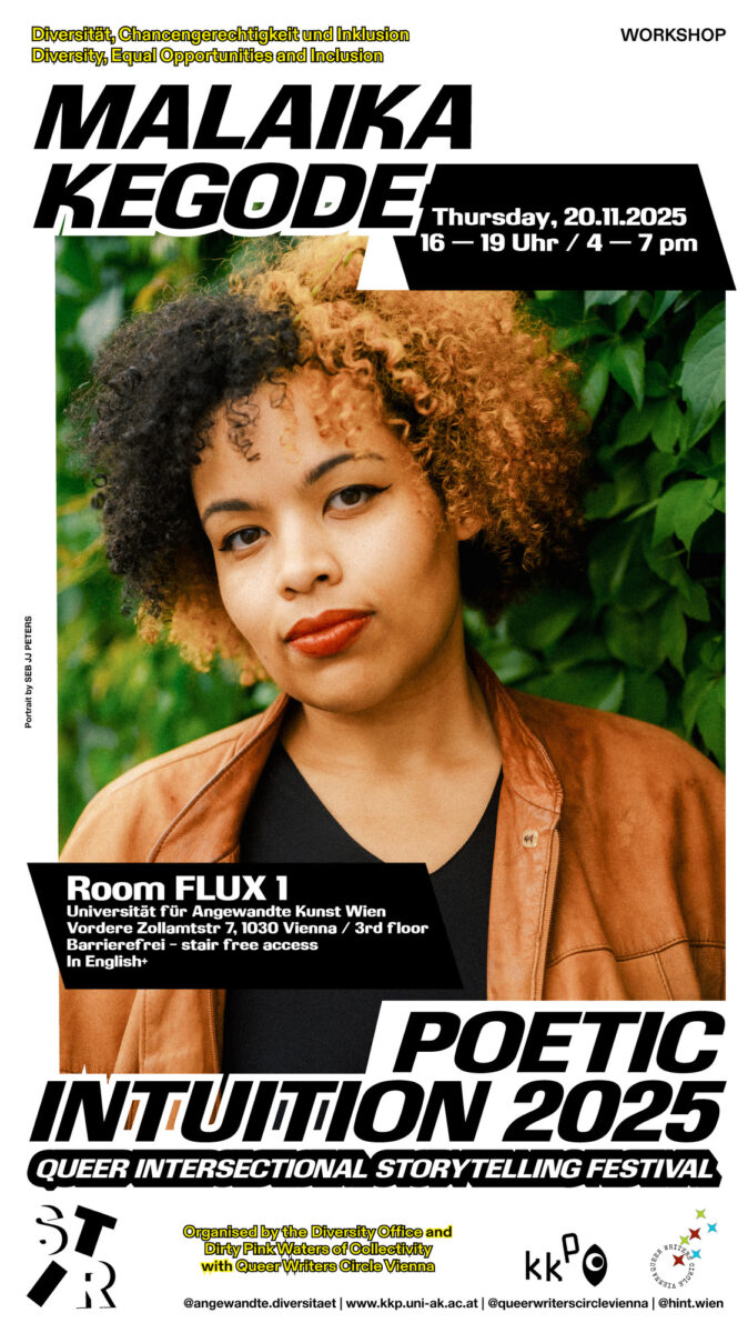 📅 DAY 3–Sat, 22 Nov (12:00/13:00–17:00) 📍 Die Angewandte Universität – Queer-community writers workshop on performance & identity Facilitated by Malaika Kegode (Vorderer Zollamtstr. 7, exact time TBC)